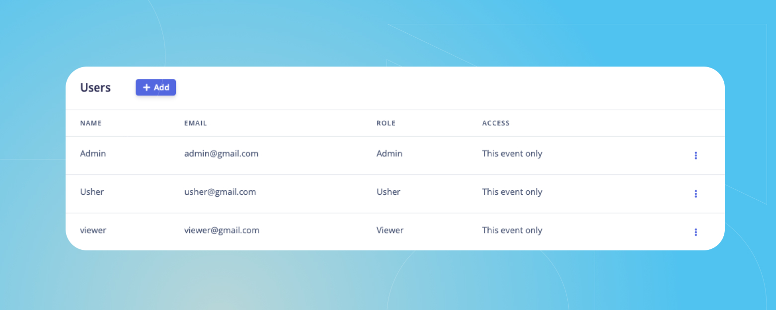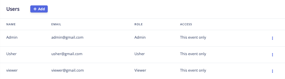 | Usher | Can manage attendees and check-in only. | Ushers of the event. |