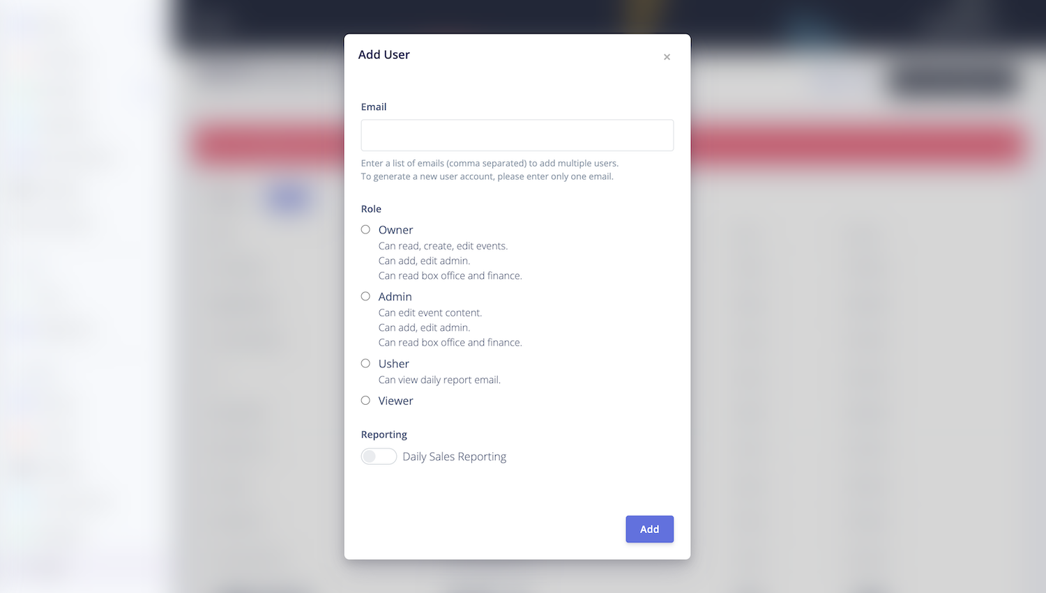 2. To add a new user to an event, simply click the "+ Add" button, input their email address, and choose the role you wish to assign them. For new users to CloudJoi, please include their full name and contact number in the subsequent pop-up field. You can also choose whether to receive the Daily Sales Report email to the designated email address.