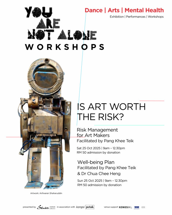 The exhibition “In Solitude: Salvaged Love” foregrounds the late Arifwaran Shaharuddin’s visual artworks—a reminder of how art can hold stories of love, resilience, and transformation. Workshops welcome participants of all backgrounds to engage their bodies and minds through grounding practices, reflection, and communal dialogues. Performances intertwine the intimacy of individual journeys with the strength of collective flow, reminding us of the beauty found in shared movement and presence.