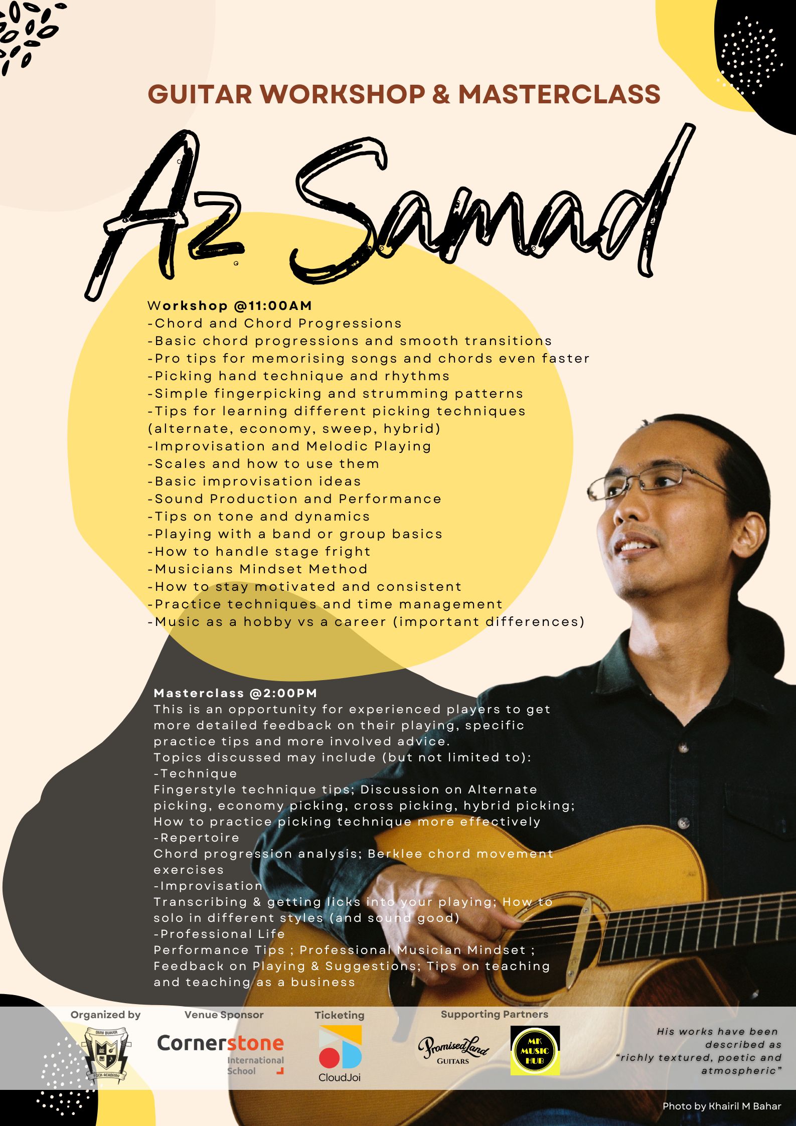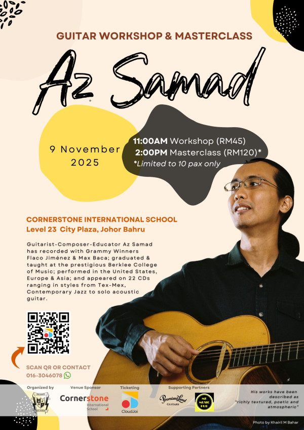 DQ Rock Academy presents:AZ SAMAD Guitar & Masterclass, Johor Bahru 2025 9 November (Sunday)Venue: Level 23, Cornerstone International School, City Plaza JB11:00-12:30 Workshop14:00-15:30 Masterclass (limited spaces)
