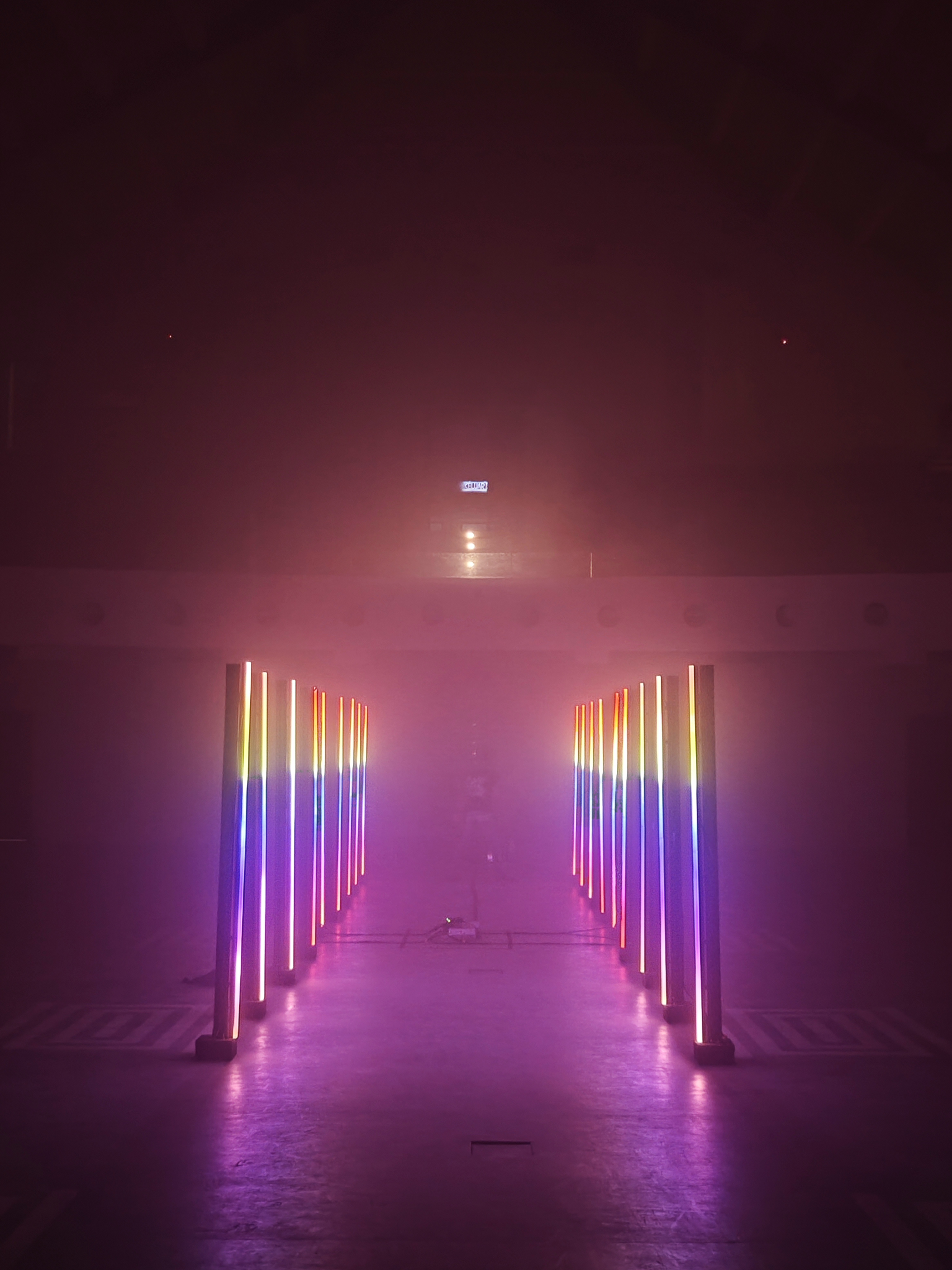 From the corridors, you are invited to step into the immersive heart of the main hall. Here, iwaz of Harum Kasturi Studio presents TIANG SERI, a large-scale, live audio-light installation that occupies the entire cinema hall. In traditional Malay architecture, the 'Tiang Seri' is the central pillar, the structural and spiritual core of a home. This installation reinterprets that concept, creating a communal, multi-sensory space that serves as a conduit between the physical and the ethereal, the individual and the collective.