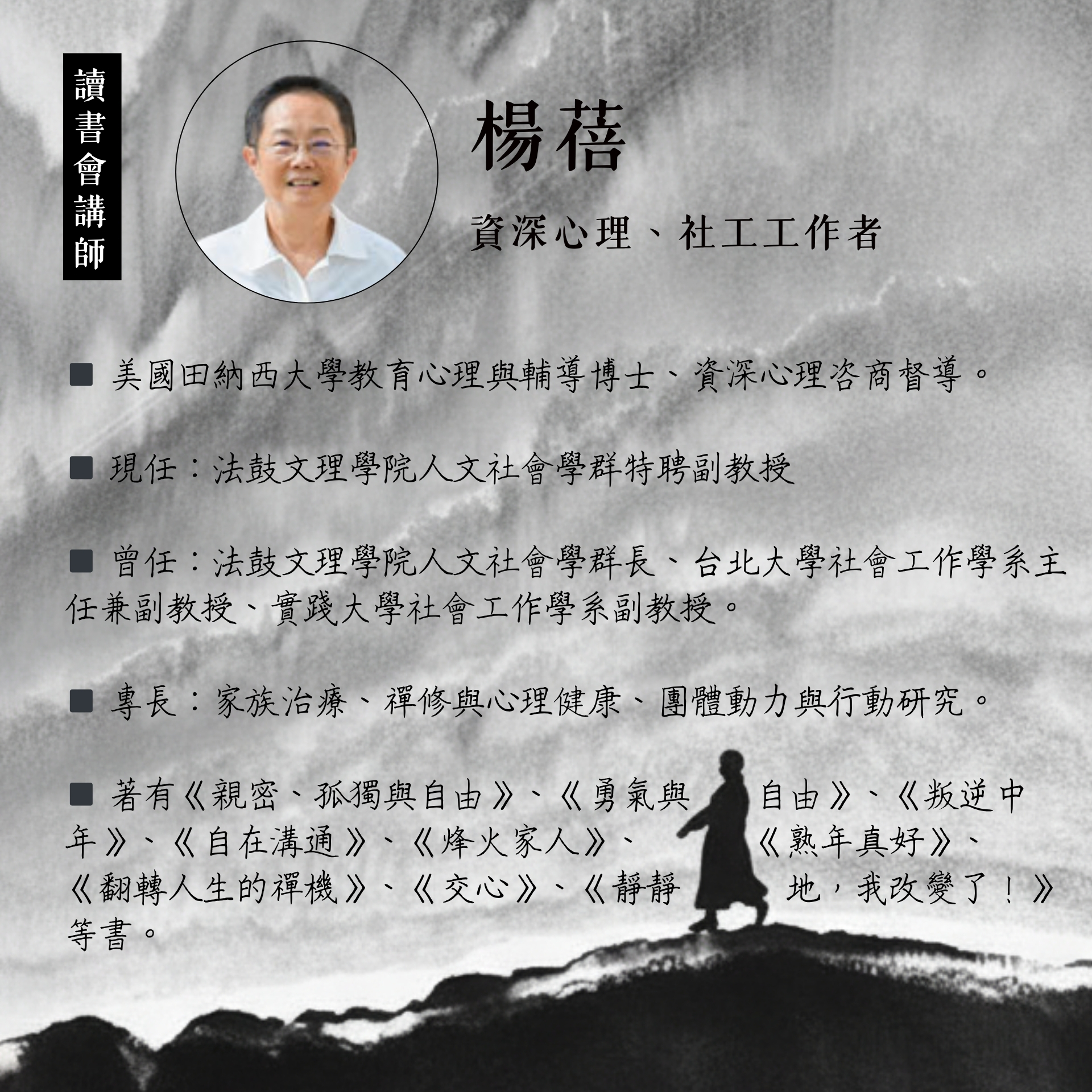 杨蓓博士是资深心理、社工工作者与法鼓山禅修者。他发现,「苦」来自于人们承负众多「角色」却缺乏觉知。我们为人子女,为人父母、学生、主管……,以为努力扮好角色,就能成功幸福。然而,社会对不同角色的期待彼此矛盾,角色与我们真实的自我需求也断裂疏离,于是我们受苦了──遭逢挫败了,跌入深渊,才发现自己原来活得如此之苦,未曾真正活出自我……