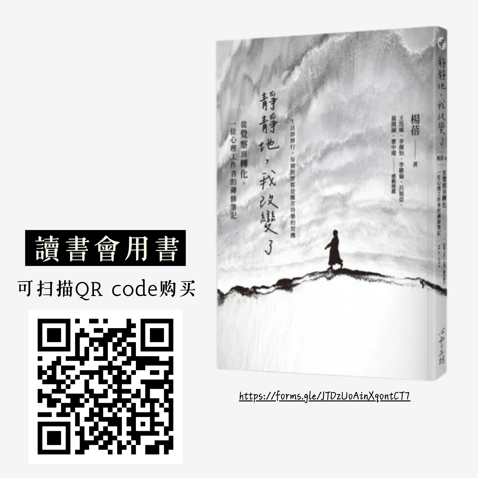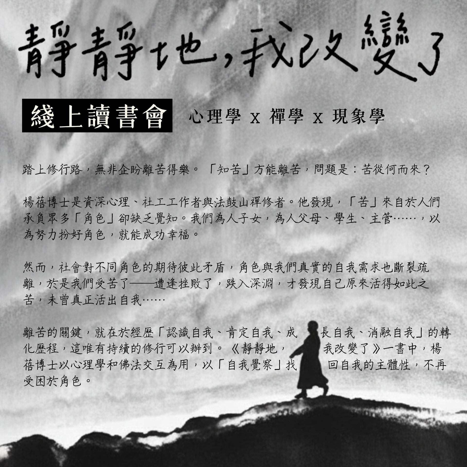 本次读书会将会依照《静静地,我改变了:从觉察到转化,一位心理工作者的禅修笔记》书中各章节的内容分段阅读与学习,学习安排如下: