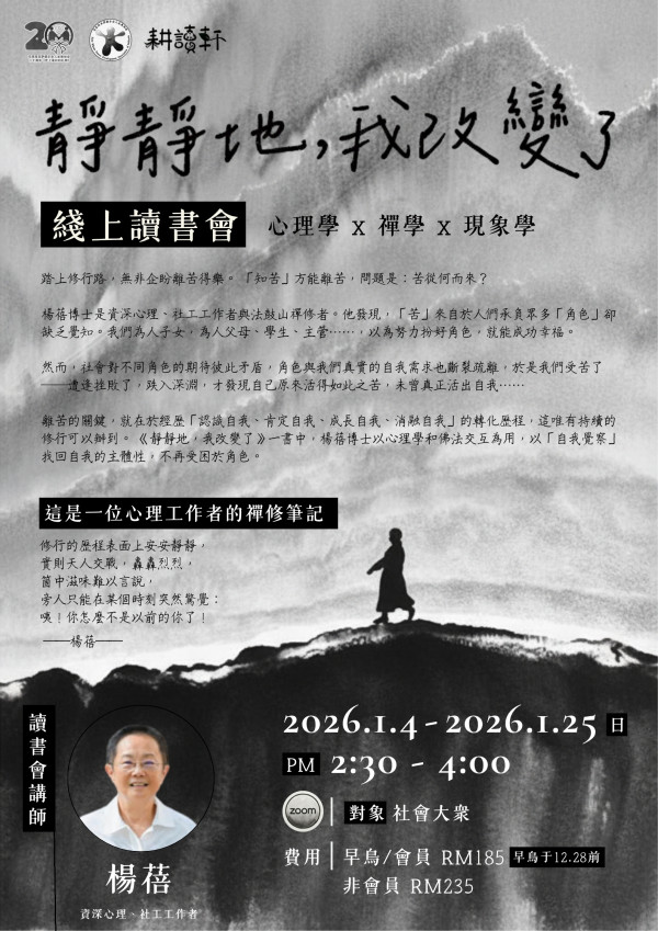 ✓ 每堂课结束后,我们将通过 Zoom 提供限时录影回放(请自行检查电子邮件和收藏)。录影将在读书会最后一堂后的两周(2026年2月8日)停止分享。
