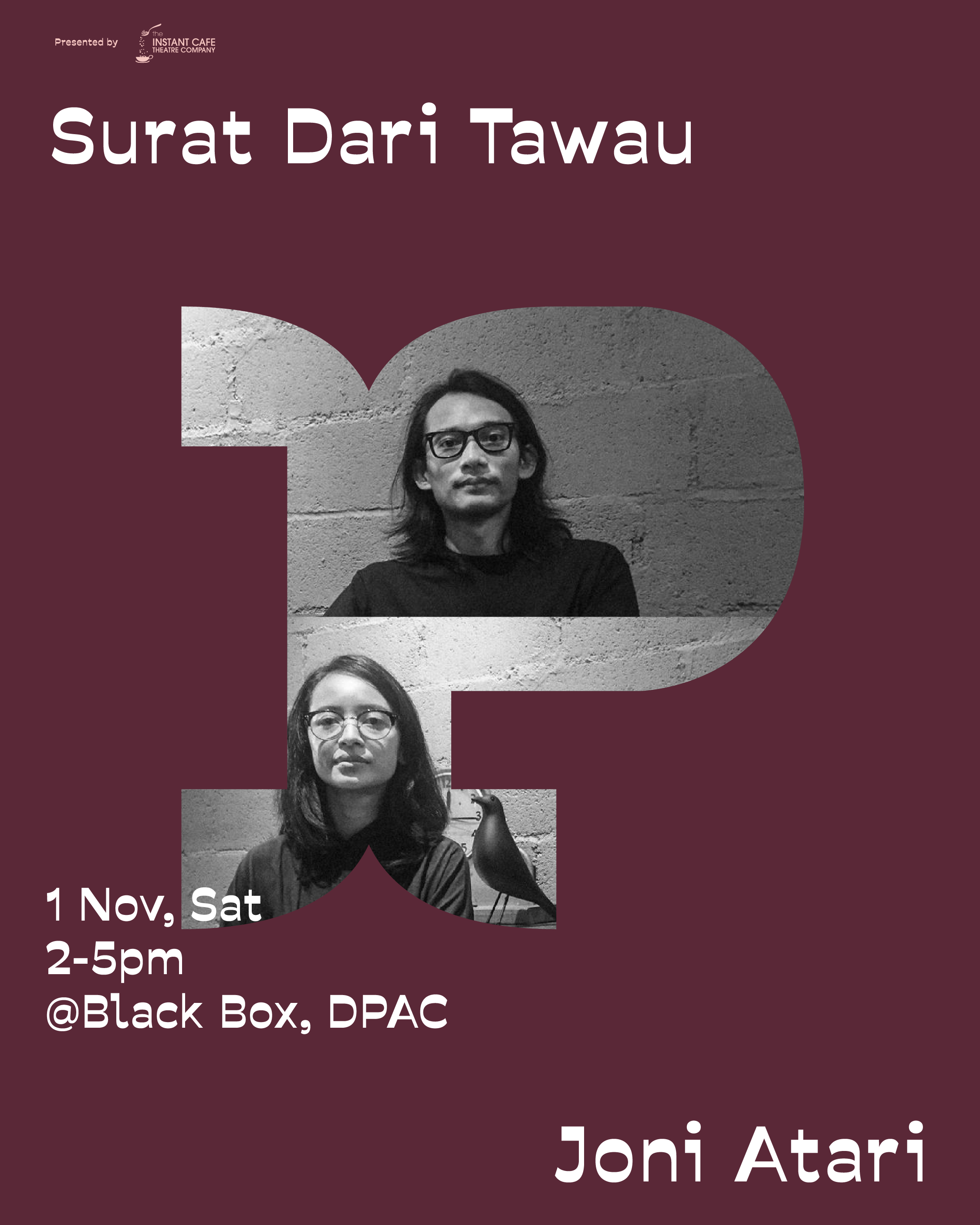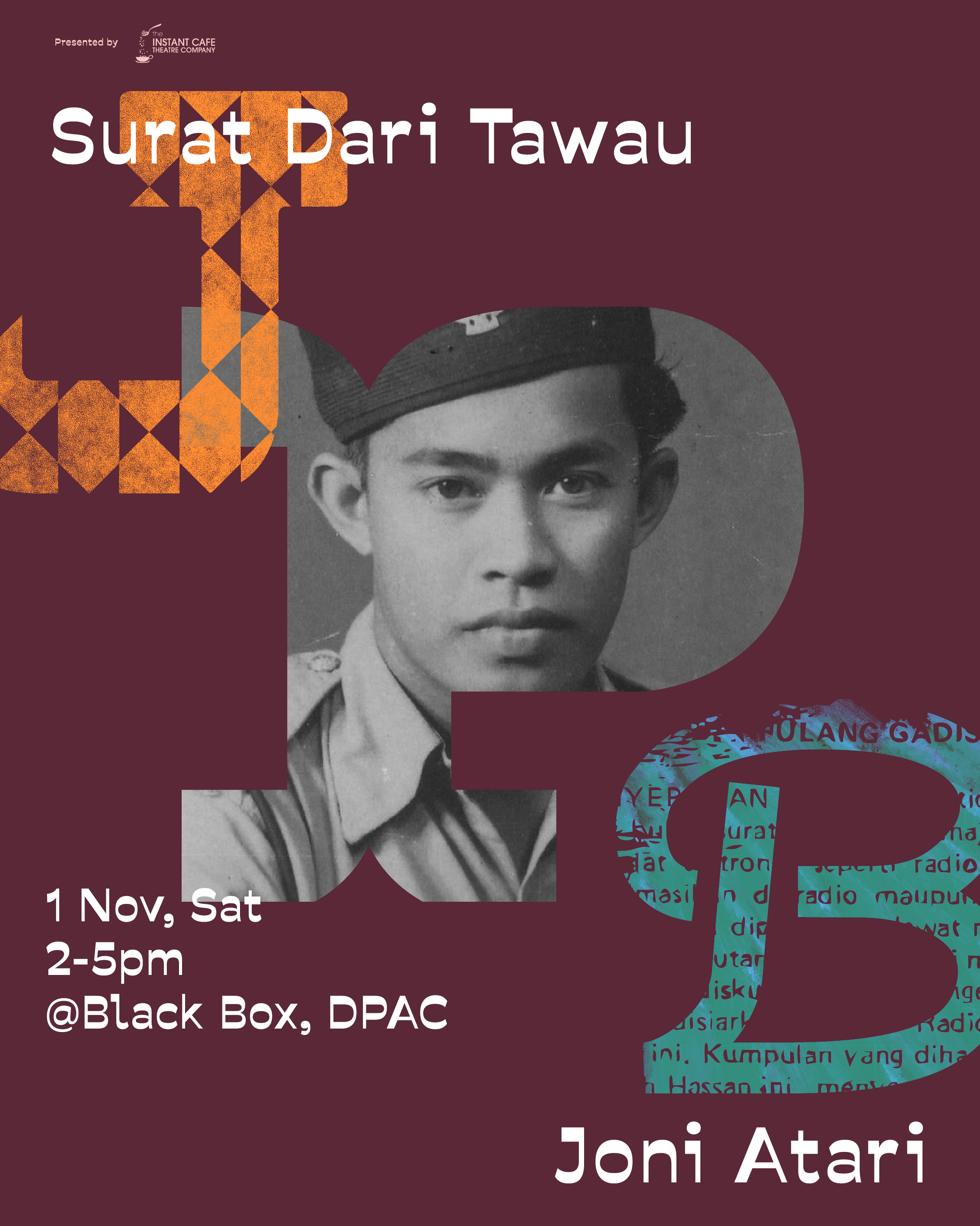 Joni Atari presents the radio drama Surat Dari Tawau by Usman Awang, which explores the Indonesia–Malaysia Confrontation, loyalty, and unfulfilled love. The pre-recorded dialogue, music, and ambient sounds will be performed live.