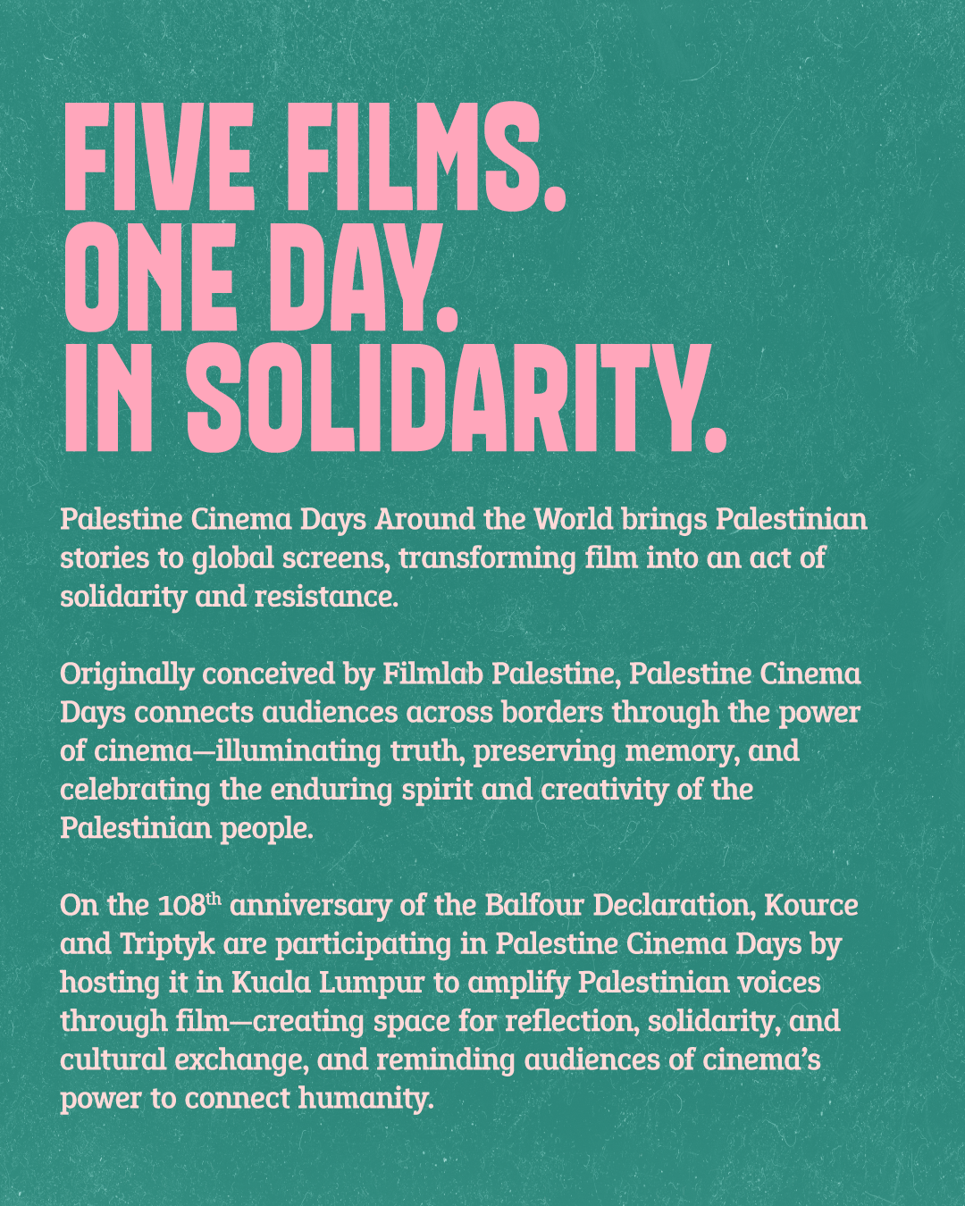 On the 108th anniversary of the Balfour Declaration, Kource and Triptyk are participating in Palestine Cinema Days by hosting it in Kuala Lumpur to amplify Palestinian voices through film—creating space for reflection, solidarity, and cultural exchange, and reminding audiences of cinema’s power to connect humanity.