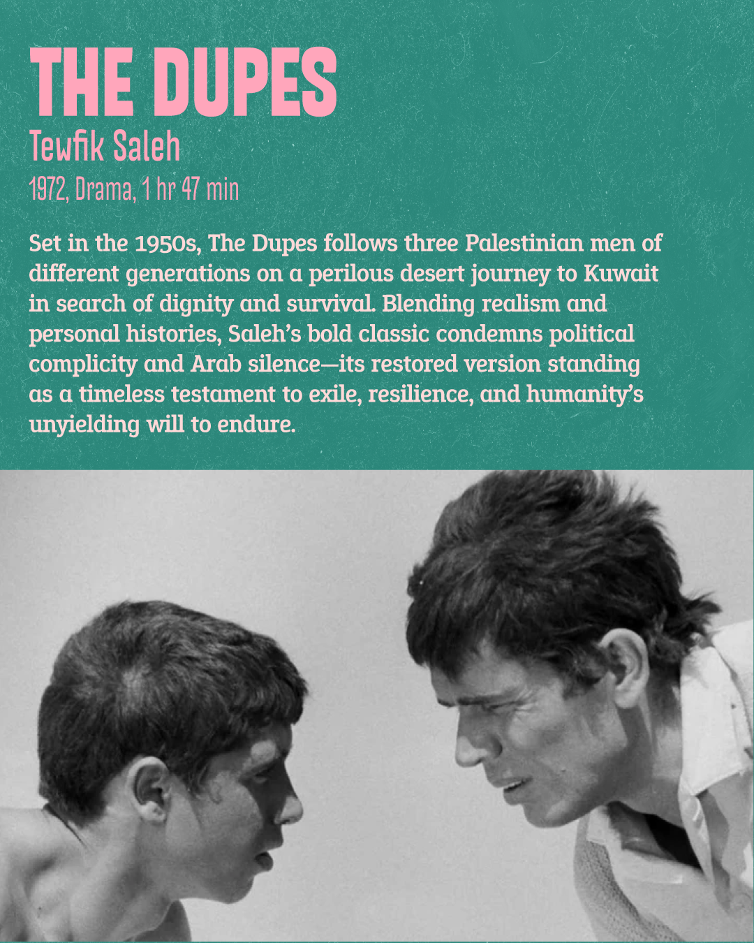 12:00PM The Dupes (dir. Tewfik Saleh, 1972) Drama. Run time, 1hr 47min