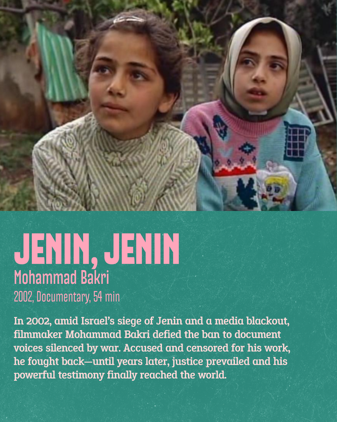 02:30PM Jenin, Jenin, (dir. Mohammad Bakri, 2002). Documentary. Run time, 54min