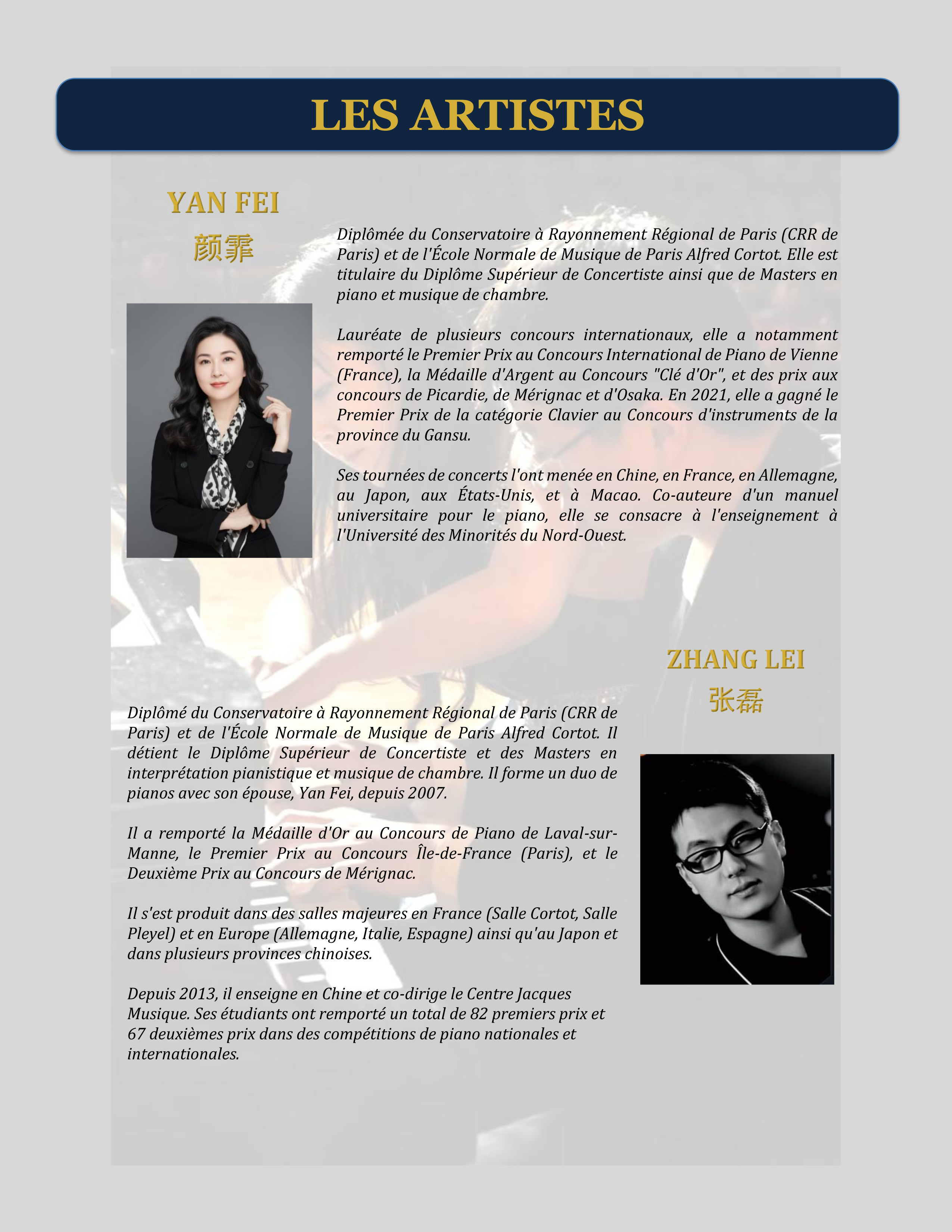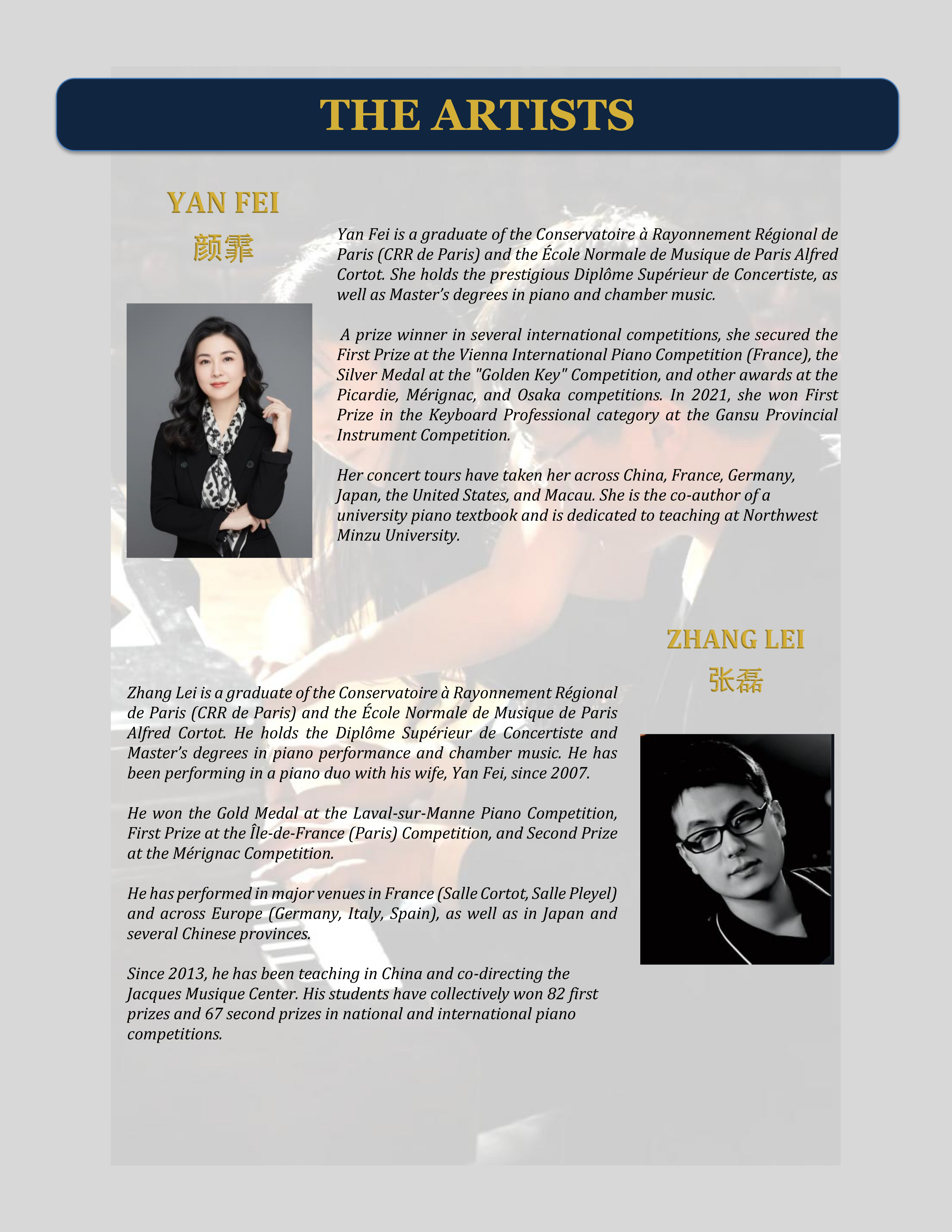 Yan Fei and Zhang Lei are not only virtuosos celebrated for their technique and expressiveness; they are passionate artists whose careers have led them from the stages of Paris's greatest conservatories to international festivals. Trained in France at the École Normale de Musique de Paris and the Conservatoire à Rayonnement Régional de Paris, these award-winning concert artists are also dedicated educators, having nurtured a generation of young talents. Their presence in Kuala Lumpur is an honor and a rare opportunity to witness a performance of this caliber.