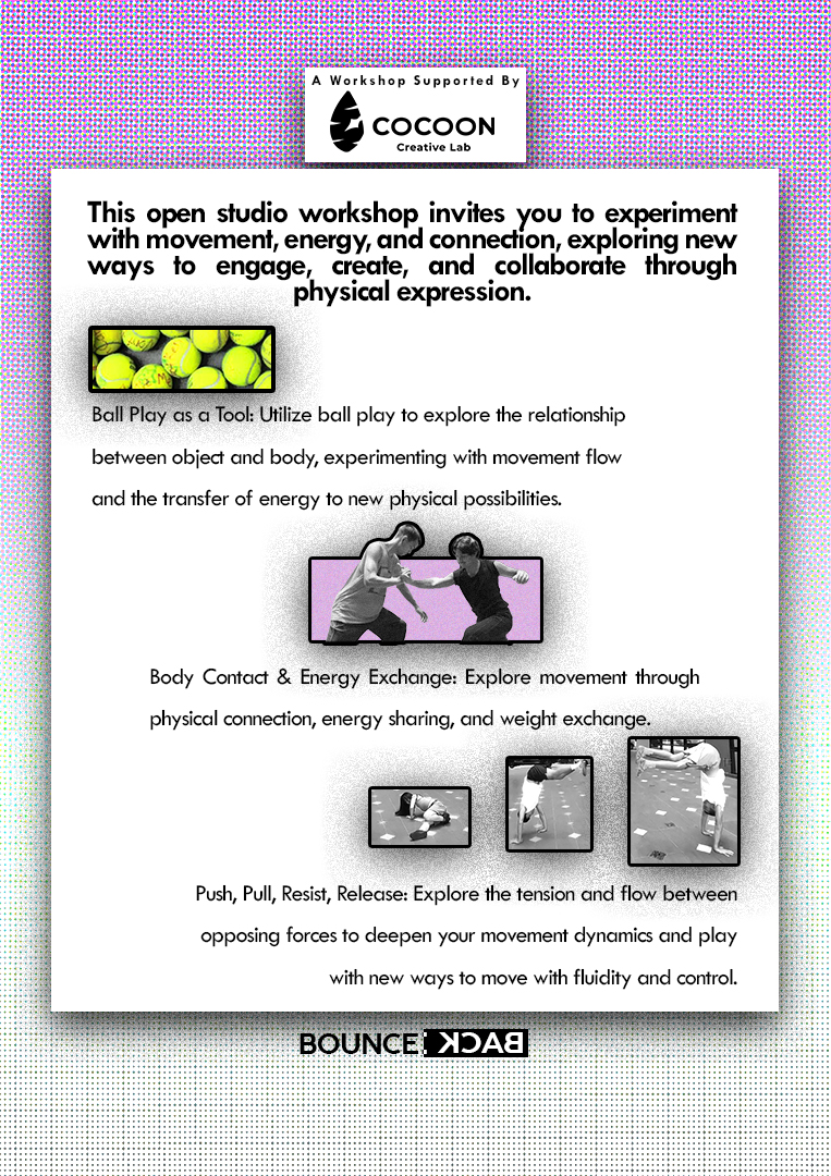 A dynamic exploration of movement where energy bounces between bodies, ideas, objects, and actions. This open studio workshop encourages you to experiment with push-and-pull dynamics and playful fight movement. Using ball play as a tool, find new ways to connect, create, and express energy in a collaborative environment.