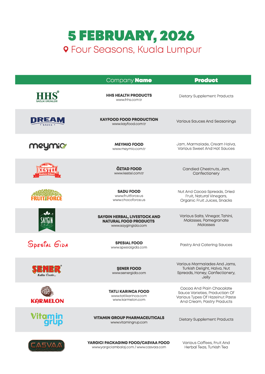 If you are a Food Importer & Distributor, Wholesaler, Retailer, Hypermarket, Supermarket, Hotel, Restaurant, Producer/ Manufacturer, Agent/Exporter, and Pharmacy/Health Retailer – you must come and meet the top participating companies from Turkiye. Find your business match and explore opportunities, and join us for refreshments.