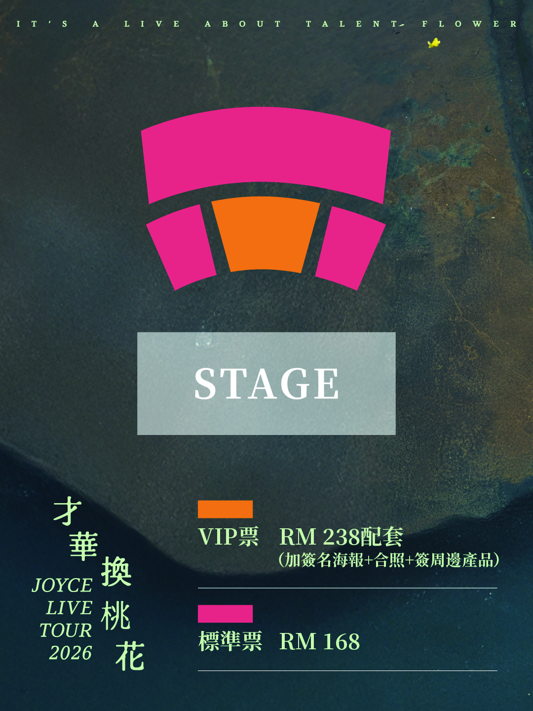 2025 年,髮行首張個人創作專輯《才華換桃花TALENT FLOWER》, 在颱灣開唱獲得不俗茴香。這次決定跨前一步,到馬來西亞🇲🇾 辦 馬來西亞第一場個人專場,將最真誠的JOYCE 就以斯的音樂呈現給馬來西亞樂迷!